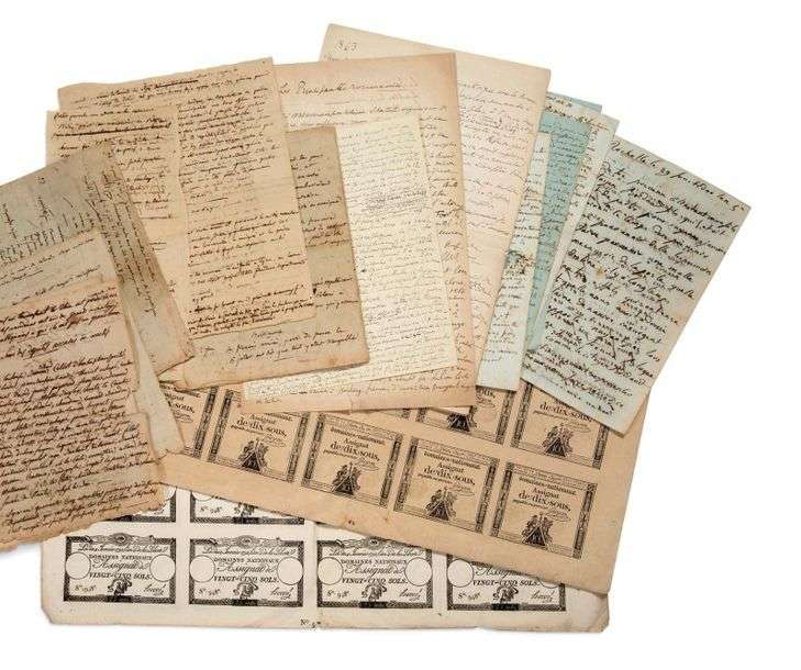 * Notes manuscrites sur la presse anglaise et américaine, 1795 (plus de 30 p. formats divers, en cahiers ou ff. volants): tendances politiques, interventions à la Convention, mouvements d'ambassadeurs, violences des chouans, illusions des émigrés, plan d'une nouvelle constitution, combats... * 5 l.a.s. de son père, Nicolas-Simon Billaud (et post-scriptum de sa mère ou son frère cadet Benjamin), à lui adressées à Cayenne, de La R