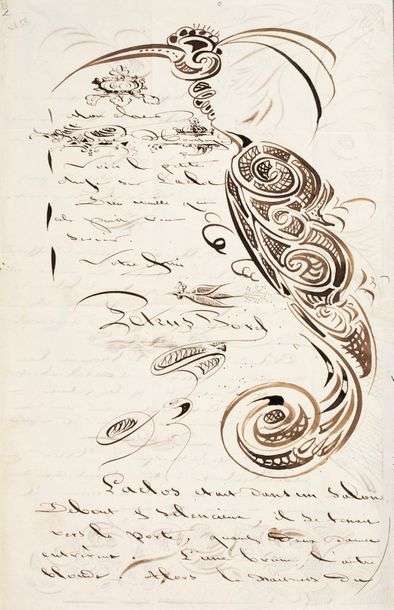 La lettre est entièrement ornée dans les marges d'étonnants dessins à la plume: sur toute la hauteur de la première page, un grand oiseau de fantaisie| sur la seconde page, de grandes arabesques décoratives.