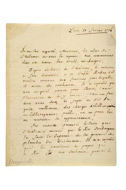L.A.S. «De Bougainville», Paris 21 février 1774| 3 pages in-4 (petites restaurations hors texte).