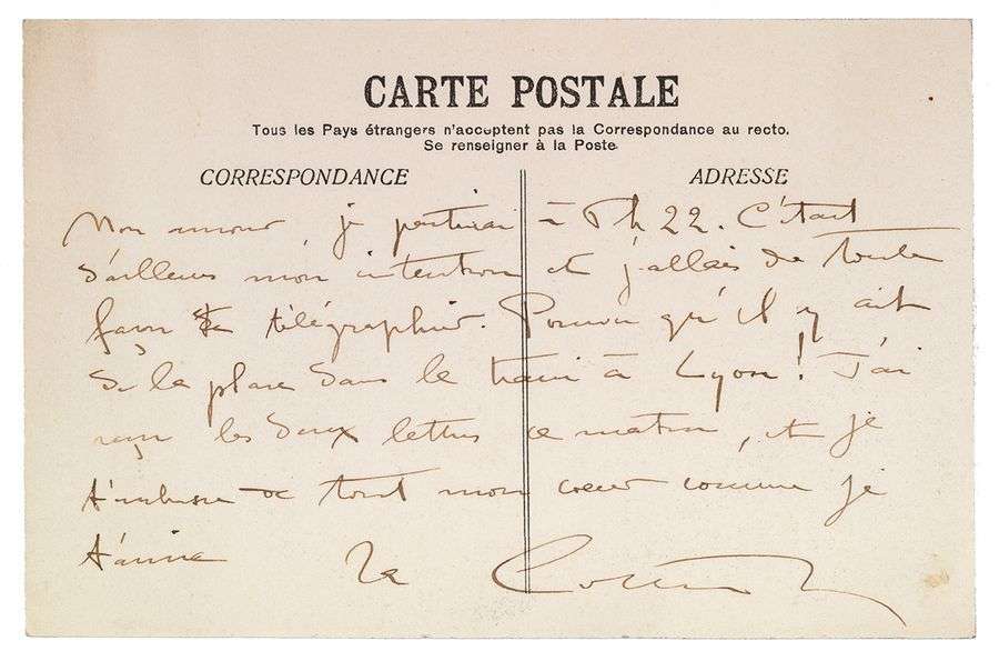 Billet amoureux à Missy. Mon amour. je partirai à 5j22. C'était d'ailleurs mon intention et j'allais de toute façon te télégraphier. Pourvu qu'il y ait de la place dans le train à Lyon ! (...) Je t'embrasse de tout mon coeur comme je t'aime