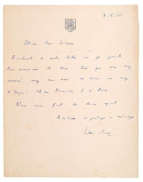 L.A.S. à son cher Lami. S.l., 7 juin 1945. 1 pp. in-4, en-tête au blason figurant la France portant une croix de Lorraine.