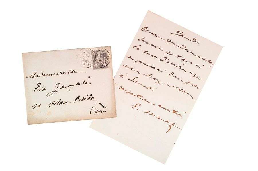 B.A.S. à Mademoiselle Eva Gonzalès. Jeudi (s.d.). 1 pp. bi-feuillet in-12| joint son enveloppe timbrée.