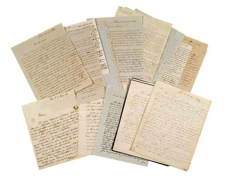 * Copie d'une lettre de Joseph BONAPARTE à sa mère, Londres 24 avril 1833: il l'invite à donner sa procuration pour la succession du «jeune Napoléon» [l'Aiglon, Napoléon II], et la met au courant de la succession de l'Empereur, faisant part de l'opinion des avocats concernant les armes de l'Empereur (3 p. in-4). * Copie d'une lettre du cardinal Joseph FESCH au général Arrighi, duc de Padoue, Rome 28 décembre 1833: Madame s'en remet au comte de Survilliers [Joseph Bonaparte] pour la décharge générale, et donne des instructions concernant les armes et d'autres objets de l'Empereur (1 p. in-4). * L.A.S. du cardinal FESCH, à son neveu Joseph Bonaparte, Rome 2 janvier 1834, sur le voeu de Madame que les dispositions de l'Empereur soient exécutées sans transaction ni procès avec Laffitte (2 p. in-8, en italien). * 2 copies de la transaction entre le duc de PADOUE, agissant pour Madame Mère, et Jacques LAFFITTE, 8 janvier 1834 (10 p. in-4). * Copie d'une lettre de Joseph BONAPARTE au duc de Padoue, Londres 20 janvier 1834, demandant des éclaircissements sur les rapports entre les droits de la mère de l'Empereur et la succession du Prince Eugène (1 p. in-4). * L.S. de l'avocat PATORNI au duc de Padoue, Paris 5 mars 1834, évoquant les droits respectifs de Madame Mère et des époux SEMONVILLE (2 p. in-4). * 2 brouillons successifs, avec additions et corrections autographes, d'une lettre de JOSEPH BONAPARTE à sa mère, 23 mars 1834, évoquant le déficit en caisse et la proposition parlementaire d'amnistier leur famille (5 p. in-4). * L.S. en partie autographe du cardinal FESCH à son neveu Joseph Bonaparte, Rome 1er avril 1834 (2 p. in-8, en italien), notamment au sujet des domaines dans l'île d'Elbe. * L.S. du duc de PADOUE au cardinal Fesch, Pa