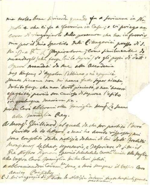 Rare et longue lettre, réclamant le paiement de sa pension et se plaignant du retard porté à son versement| il parle également de l'achat d'un tableau de Rondenoer (?) qu'il prie de lui envoyer par Marseille, etc. Il remercie PAËR d'avoir bien voulu donner à S.M. l'Empereur la primeur des Pittagorici (dernier opéra de Paisiello, créé au San Carlo de Naples le 19 mars) et remis la partition à l'Académie des Enfants d'Apollon...