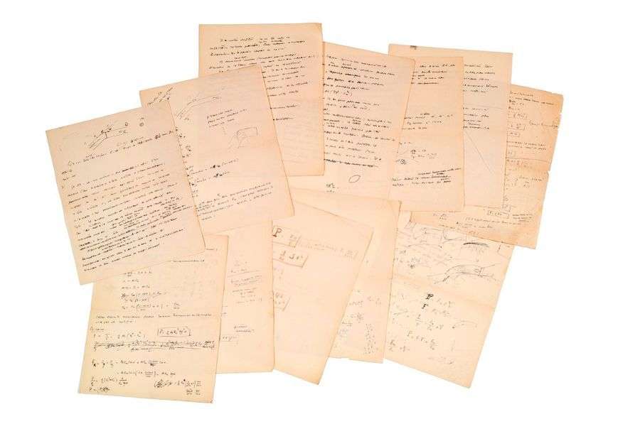 Important manuscrit au brouillon, chargé de croquis scientifiques commentés et annotés, de calculs et d'équations