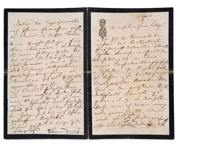 L.A.S. «Johann Strauss», 16 avril [1878, à Jakob ENGEL, directeur du Kroll Oper à Berlin]| 4 pages in-8 à son chiffre (deuil| petite fente au pli)| en allemand.