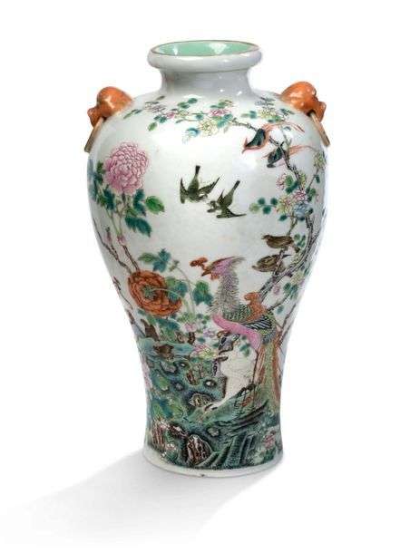 Vase en porcelaine et émaux de la famille rose, à panse haute, orné d'un couple de phénix et de couples d'oiseaux, parmi rochers, pivoines en fleurs, prunus, lotus| l'épaule rehaussée de deux têtes de félin émaillées corail, tenant des anneaux| l'intérieur et la base vert pâle. Marque Zhu xiao shan fang sur la base.