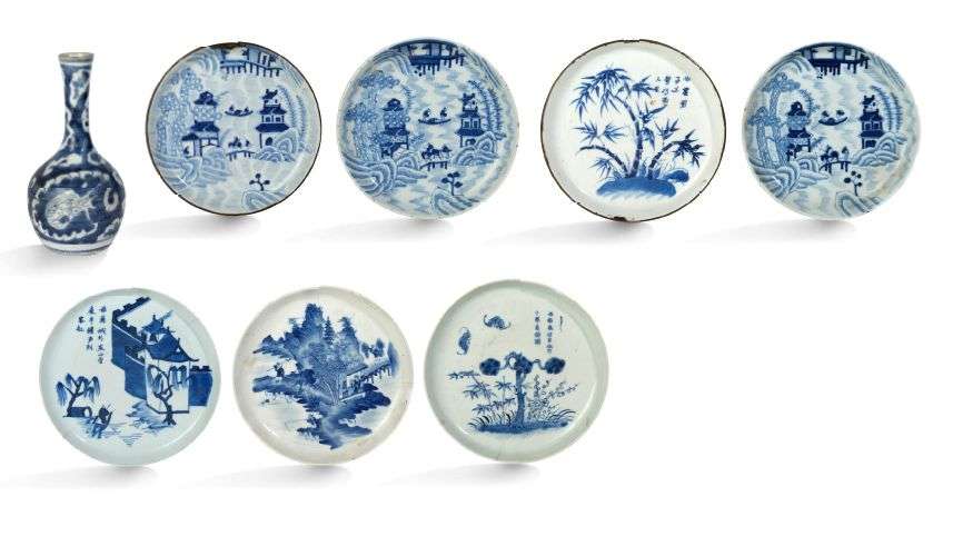 Lot de sept assiettes et un petit vase en porcelaine bleu-blanc, dit «bleu de Hue», dont trois à décors similaires de paysage lacustre, et quatre à décors floraux différents| le vase orné d'un dragon parmi des nuages stylisés. Marque Ngoan ngoc sur six d'entre elles.