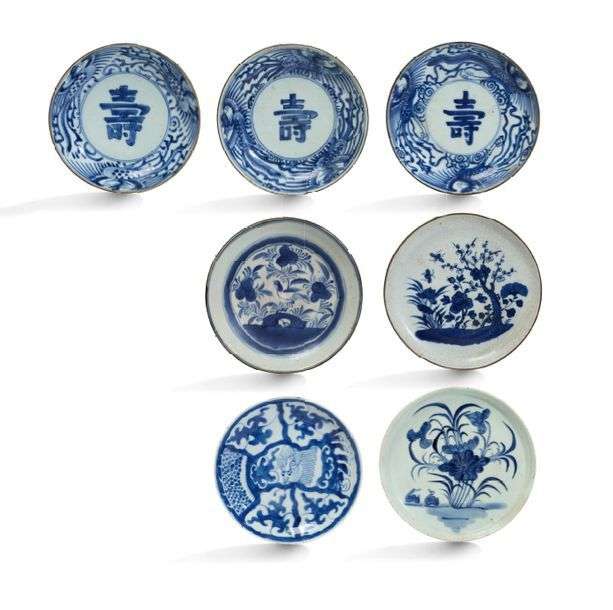 Lot de sept assiettes en porcelaine bleublanc, dont trois à décor du caractère