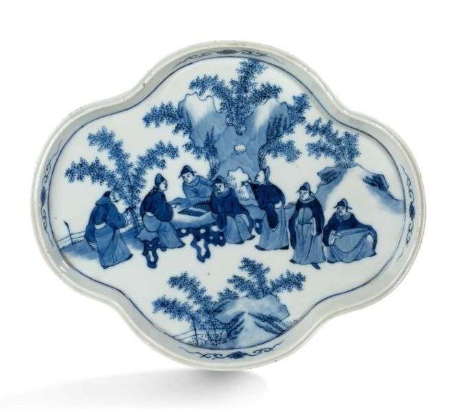 Plat quadrilobé en porcelaine bleu-blanc, à décor représentant les sept sages de la forêt de bambous.