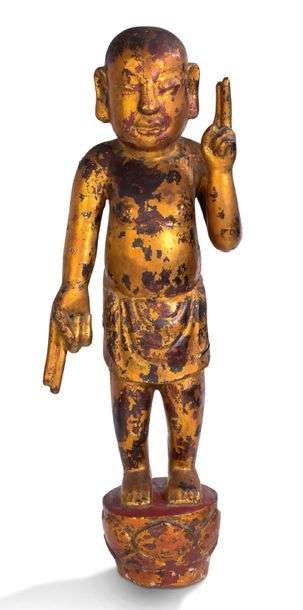 Sujet en bois laqué or représentant le Bouddha enfant, debout sur un lotus, le bras gauche replié, l'index et le majeur pointés, la main droite vers le bas, pointant également de l'index et du majeur.