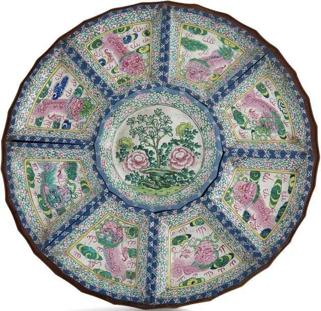 Ensemble à hors d'oeuvres en émaux polychromes sur cuivre, comprenant neuf raviers dont un central, huit à décor de lions bouddhiques et motifs floraux, le neuvième orné de fleurs. Avec un plateau en bois polylobé.