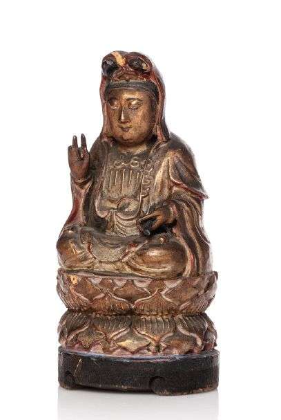 Petit sujet sculpté en bois laqué or, rouge et bleu, représentant Guanyin assise sur un socle de lotus, les yeux mi-clos avec un chigon haut, portant une parure, la main droite en geste d'enseignement, la main gauche tenant une tige de lotus.