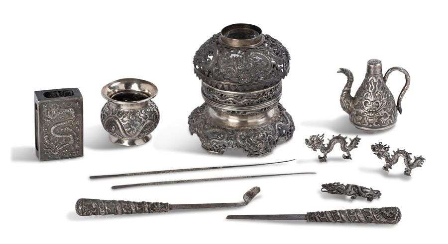 Nécessaire à opium en argent à décor en repoussé de dragons comprenant une lampe, une petite verseuse, un petit récipient, deux grattoirs, un étui et deux petits support à instruments, deux aiguilles.