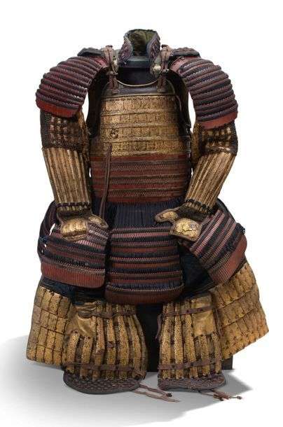 Armure japonaise en fer laqué rouge negoro et or. L'ensemble est en suite.