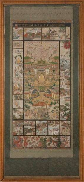 Importante peinture en couleurs et rehauts or sur papier, représentant le Kammuryôju-Kyô hensô, ou Taima Mandala.
