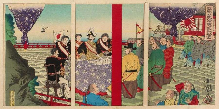 triptyque d'estampes de la guerre sino-japonaise, représentant une entrevue officielle entre le ministre de l'île d'Oshima et les représentants chinois.
