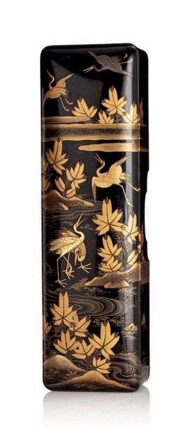 Fumibako en laque, à décor en hira et takamaki-e et parsemé d'aogai sur fond ro-iro, représentant des échassiers parmi des érables et nuages stylisés.