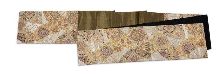 Bel obi en soie broché à décor brodé de fils dorés et polychromes, d'éventails ornés de motifs de brocard, sur fond argent.