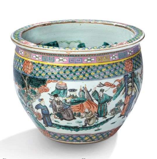 Vasque à poissons en porcelaine et émaux de la famille rose, à décor de scènes de bataille et d'une scène de reddition, dans un paysage de pics montagneux arborés de pins, des frises au pied et au col à motifs de fleurs et géométriques.