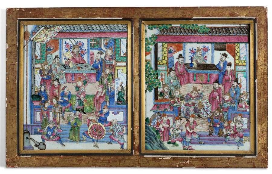 Bel ensemble de quatre plaques en porcelaine et émaux de la famille rose, à décor de scènes de palais animées de musiciens et danseurs, acteurs reproduisant des scènes de bataille, et visite d'émissaires auprès d'un seigneur.