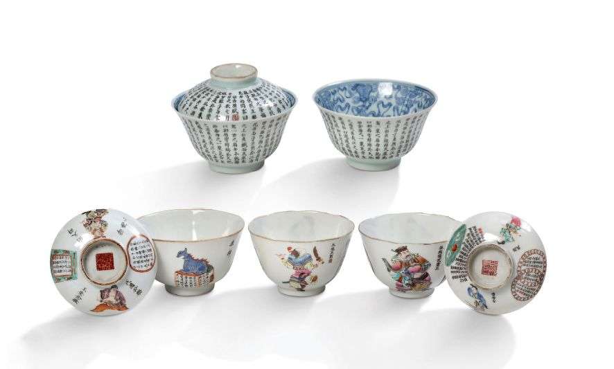 Lot de cinq coupes en porcelaine, dont trois à décor en émaux de la famille rose, de personnages célèbres identifiés par des cartouches, deux avec couvercle| une paire de coupes ornées à l'intérieur de motifs auspicieux en bleu, le revers recouvert d'un poème, l'une avec couvercle.