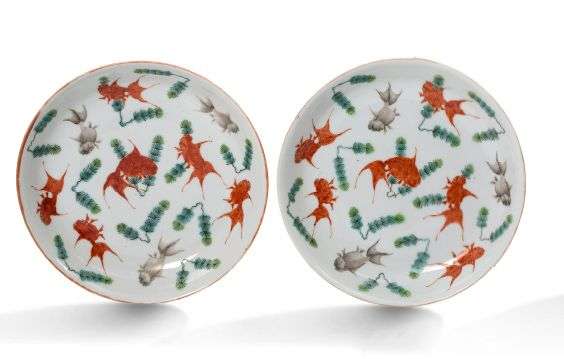 “道光“款粉彩珊瑚釉鱼草纹盘一对