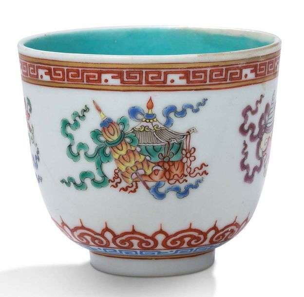 Petite coupe en porcelaine et émaux de la famille rose, à décor des huit emblèmes bouddhiques parmi des rinceaux, les bords soulignés de frises de grecques et ruyi.