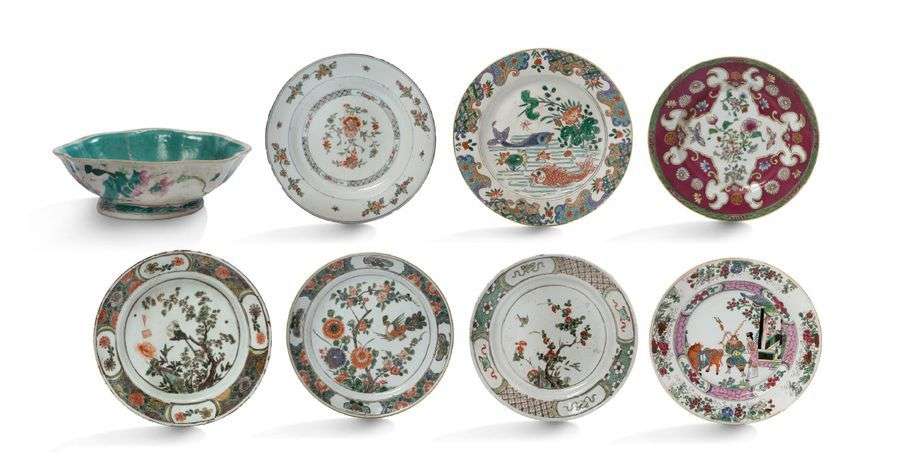 Lot de sept porcelaines, dont quatre de la Companie des Indes en émaux de la famille verte, à décor de fleurs, insectes et oiseaux. Les trois autres en émaux de la famille rose, représentant des personnages, des carpes et des fleurs.
