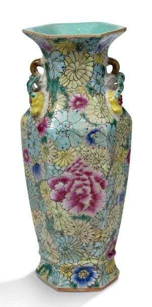 Vase hexagonal en porcelaine de la famille rose avec un col évasé, à décor de mille fleurs de chrysanthèmes et pivoines, orné de deux anses en forme de fruits.