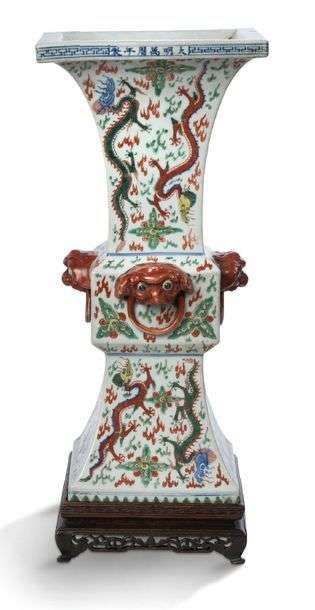 Vase Gu quadrangulaire en porcelaine et émaux de la famille verte et corail, à décor de dragons parmi des nuages stylisés, quatre anses formées par des têtes de lions retenant des anses ornent la section centrale. Le bord et le pied soulignés de frises à motifs géométriques.