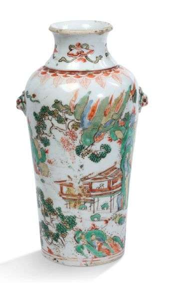 Petit vase balustre en porcelaine, à décor en émaux de la famille verte et corail d'un paysage lacustre animé de personnages, embarcations et pavillon, parmi des rochers et pins de longévité, le col orné du parasol bouddhique, motifs floraux et feuilles de bananier. Deux têtes de lions forment les anses.