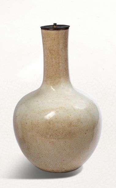 Grand vase bouteille à large panse et long col, en grès émaillé beige craquelé.