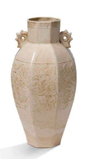 Vase balustre octogonal en céramique émaillée crème, à décor moulé de fleurs de lotus et pivoines, une frise de volutes orne le col, deux anses stylisées à la base du col.