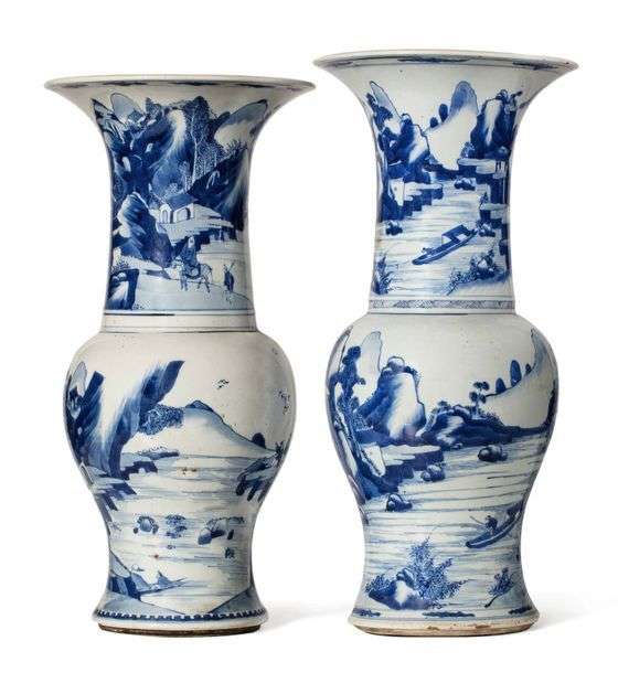 Lot de deux vases balustre à haut col et ouverture évasée en porcelaine bleu-blanc| l'un à décor d'un paysage lacustre animé d'embarcations, pêcheurs et personnages traversant un pont entouré de pics montagneux| l'autre à décor de sages observant un fleuve depuis une falaise et de pêcheurs et cavaliers devant un paysage montagneux.
