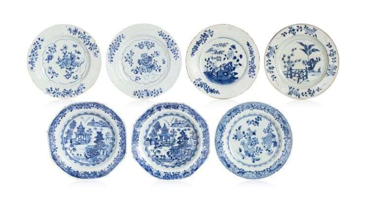 Lot comprenant sept assiettes en porcelaine bleu-blanc de forme circulaire et polylobée, à décor de fleurs et de paysage lacustre.