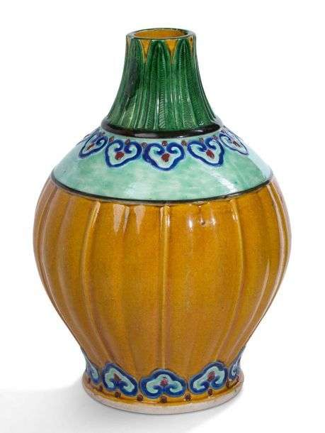Vase reprenant la forme d'une citrouille en porcelaine émaillée jaune, vert, bleu et rouge, le pied et la base du col ornés de ruyi, le col avec des motifs de feuilles de bananiers.
