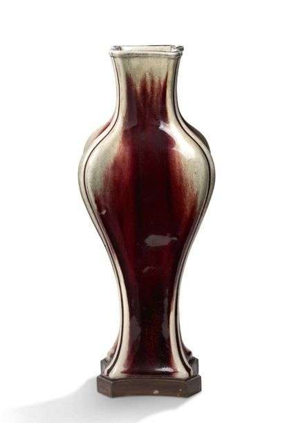 Vase balustre quadrangulaire polylobé en porcelaine et émail céladon craquelé flammé aubergine. Socle en bronze.