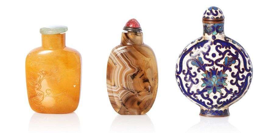 Trois flacons-tabatières dont deux en agate, l'une rubannée, l'autre couleur miel à décor floral incisé, la troisième en émaux cloisonnés sur cuivre à décor de rinceaux en bleu sur fond blanc. Marque apocryphe