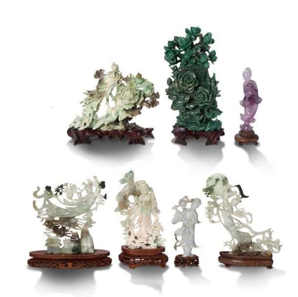 Lot de sept objets en pierres dures et verre comprenant une déesse du printemps en jadéite, trois divinités féminines en jade taché de vert et brun, l'une avec un phénix, une autre avec lapin et lune, la troisième volant dans les nuages| un paon parmi des pivoines, en jade veiné de brun et vert| un sujet féminin en vert imitant l'améthyste| un vase couvert en serpentine vert foncé mouchetée de blanc, sculpté en ronde-bosse d'un rosier sur une face et d'un magnolia sur l'autre, ce dernier se poursuivant sur le couvercle. Avec socles.