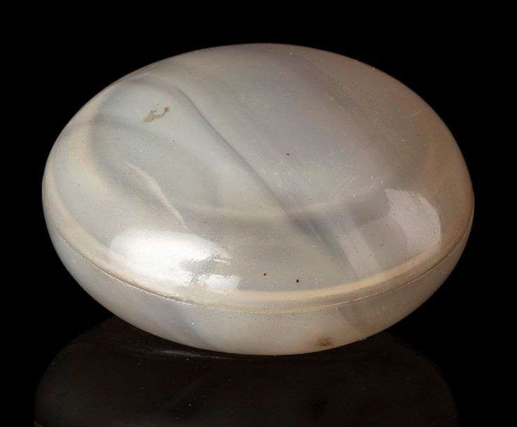 Petite boîte circulaire en agate beige claire, marque apocryphe de «Qianlong Nianzhi» sur la base. Ancienne trace de dorure.