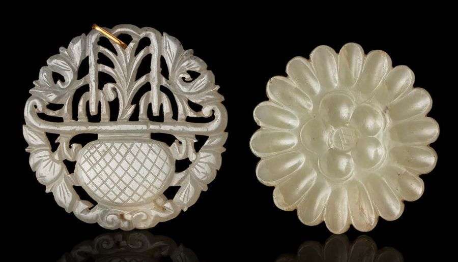 Deux petits pendentifs circulaires en jade à décor ajouré d'un vase fleuri pour l'un, l'autre reprenant la forme d'une fleurs épanouie.