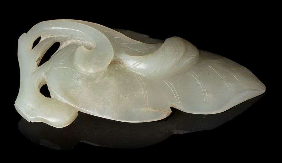 Sujet en jade céladon, sculpté en forme de feuille de pêche sur laquelle reporse une cigale.