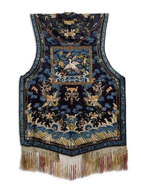 Veste sans manches en soie et lin brodés de fils polychromes sur fond bleu marine, la partie frontale à décor au centre de rang de mandarin orné d'échassiers, des dragons poursuivant la perle sacrée parmi des nuages survolant les trois pics montagneux, des vagues écumantes et chevrons dans la partie inférieure, le col est souligné par une frise de fleurs. Le bas de la veste est orné de franges. Le dos est orné d'un rang de mandarin à motif d'échassier et chauves-souris, et de deux phénix en vol.