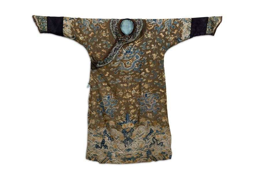 Robe en soie et lin brodé de fils en camaïeu de bleu et polychrome, à décor sur fond tabac d'un dragon de face regardant le joyau sacré en partie centrale, et d'autres dragons en partie basse ainsi que sur les manches.