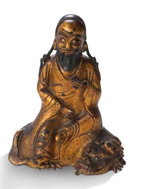 Sujet en bronze laqué or représentant un Immortel taoïste assis sur une chimère couchée.