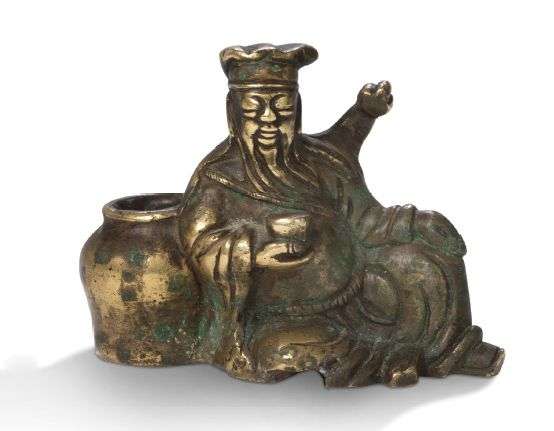 Petit vase en bronze doré, en forme d'un des dieux immortels: Lu Dongbin, allongé et s'appuyant contre une jarre.