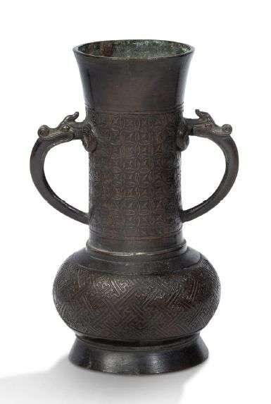 Petit vase pansu à long col en bronze de patine brune, à décor de motifs géométriques, deux anses crachées par des têtes de dragons.