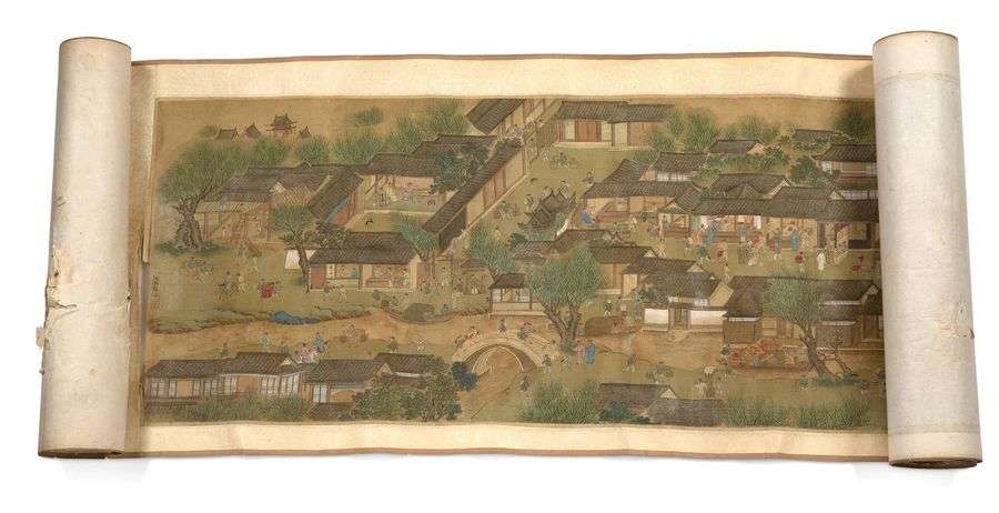 Grand rouleau horizontal, encre et couleurs sur soie, copie de la fameuse peinture ‘Le Jour de Qingming au bord de la rivière', l'origine est attribuée à Zhang Zeduan. Elle représente la vie qutidienne des gens de la période Song, dans la capitale de l'époque Bianjing.