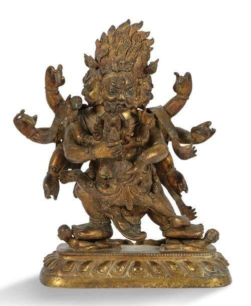 Sujet en bronze doré représentant un Dharmapâla à trois têtes et huit bras enlaçant sa shakti dans la position alidasana, et piétinant ses ennemis, tenant un vajra et un kapala, et effectuant le geste mukura (mukuramudra). Il est vêtu de la peau d'éléphant et porte une couronne et un chapelet de crânes. Manque une patte à la peau d'éléphant